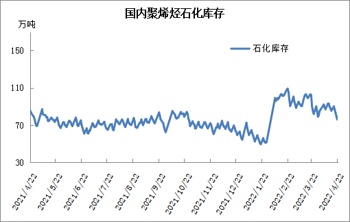 本周石化去库提速,周内去库14万吨,创出春节之后最低点。目前聚烯烃供应端检修较多,开工率长期维持在90%以下,新装置暂时未有效投产,供应压力明显缓解。虽然需求偏弱,但是防疫物资、家电等个别领域需求较好,并且随着疫情缓解,需求有望继续恢复,上游库存压力不大,但是社会库存压力仍在。