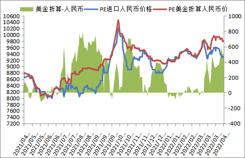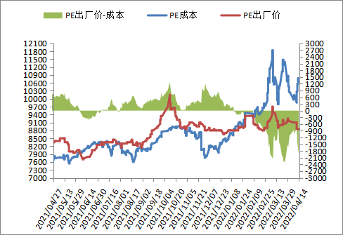 本周PE现货市场延续震荡下跌行情,尽管国际油价大涨,PE生产企业利润亏损产量下降,但是疫情影响物流运输,下游需求恢复缓慢,PE两油及煤化工库存高于上周同期水平,拖累塑料期货走弱,打压买家购买积极性,现货市场报价回落,市场成交气氛一般。
