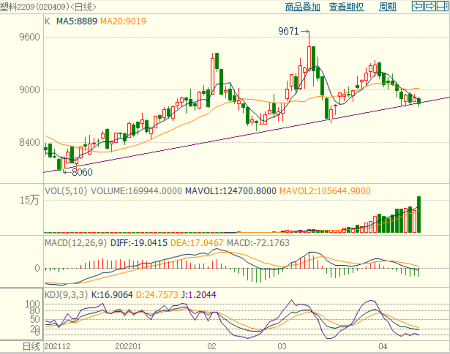 本周塑料期货09合约震荡下跌,尽管国际油价大涨,但是疫情拖累下游需求表现疲软,PE两油及煤化工库存下降缓慢,拖累塑料期货走弱,PE生产企业利润亏损产量下降,疫情有望好转,下游需求预期利好,预计塑料期货仍有反弹机会,仅供参考。