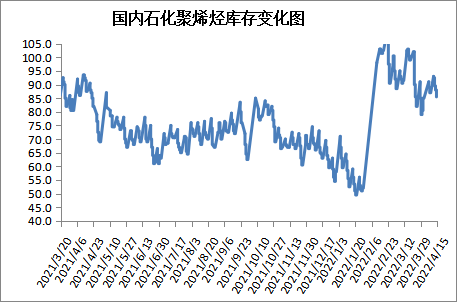 截至4月15日生产企业聚烯烃库存在85.5万吨,较上周同期下降1.5万吨,国内PE生产企业利润亏损产量下降,进口货源冲击压力偏轻,不过下游需求上升缓慢,拖累库存下降步伐,下周PE部分检修装置计划开车,疫情影响下游需求,拖累库存下降步伐。