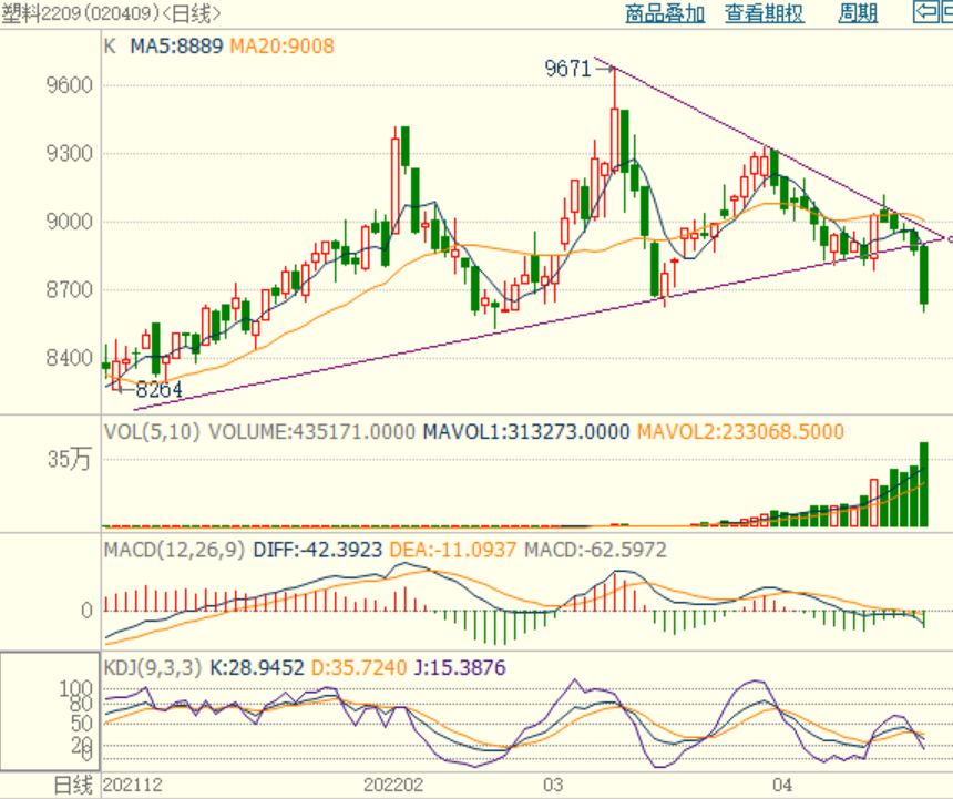 塑料期货09合约维持下跌行情,美联储加息政策拖累国际油价走弱,疫情拖累下游需求表现疲软,PE生产企业产量上升,PE两油及煤化工库存下降缓慢,拖累塑料期货走弱,不过待疫情好转后,下游需求有修复预期,预计塑料期货仍有反弹机会,仅供参考。