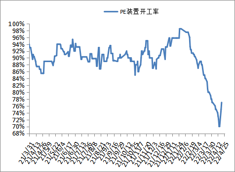 国内PE开工负荷在77%左右,日产量在5.9万吨左右,近期新增检修装置偏少,部分检修装置陆续计划开车,国内PE开工负荷仍有上升预期,5月份仍有新增大修计划,预计产量会有下降。