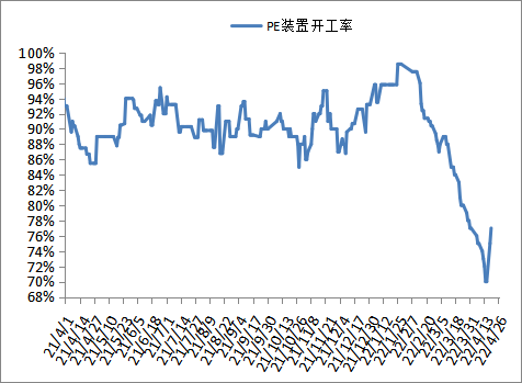 国内PE开工负荷在77%左右,日产量在5.9万吨左右,近期新增检修装置偏少,部分检修装置陆续计划开车,国内PE开工负荷仍有上升预期,5月份仍有新增大修计划,预计产量会有下降。