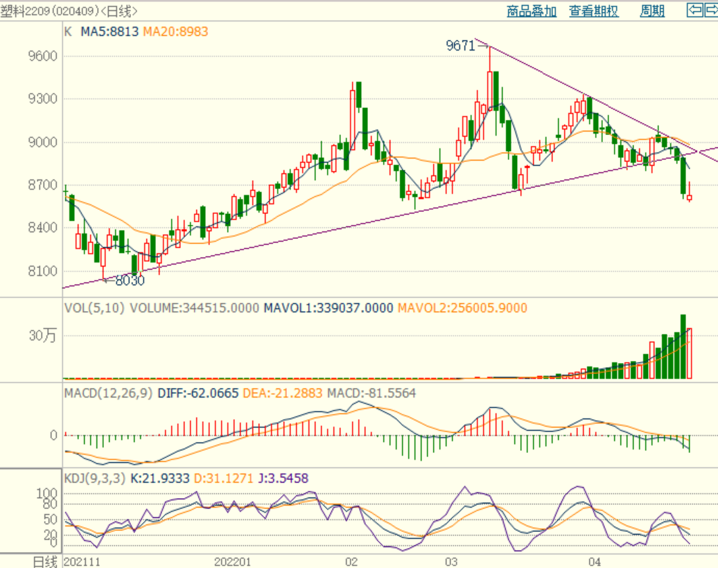 塑料期货09合约跌势放缓,疫情拖累下游需求表现疲软,PE生产企业产量上升,PE两油及煤化工库存下降缓慢,不过国际油价跌势放缓,抑制期货跌幅,后期疫情好转后,下游需求有修复预期,预计塑料期货仍有反弹机会,仅供参考。