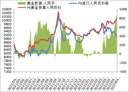 本周PE进口线性美金主流报价下跌至1220-1240,折算人民币成本在10000-10150,市场主流9150-9200,高国产线性300左右。