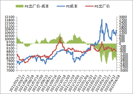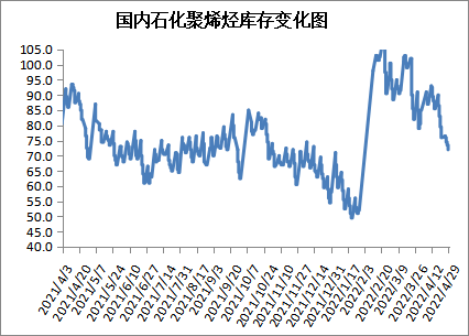 截至4月29日生产企业聚烯烃库存在72万吨,较上周同期下降4万吨,尽管国内PE生产企业产量上升,下游需求上升缓慢,但是月底两油及煤化工库存维持下降,部分库存转移成社会库存,下周PE部分检修装置计划开车,五一假期库存大概率上升。