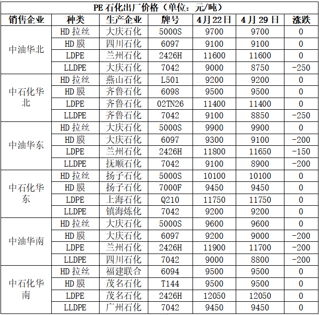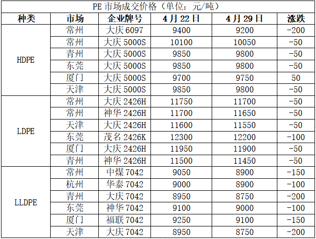 1、PE部分检修装置计划开车,下周新增检修装置偏少,五一假期两油及煤化工大概率累库;