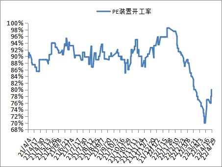 本周国内PE检修装置减少,PE开工负荷上升至80%左右,日产量上升至6.1万吨左右,五一假期后新增检修装置偏少,部分检修装置陆续计划开车,国内PE开工负荷仍有上升预期。