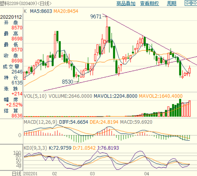 本周塑料期货09合约大跌后弱势反弹,尽管国际油价反弹,但是疫情拖累下游需求表现疲软,PE生产企业产量上升,PE两油及煤化工库存下降缓慢,抑制期货涨幅,五一假期PE库存大概率上升,除非原油大涨及政策支撑,否则期货难有大涨行情,仅供参考。