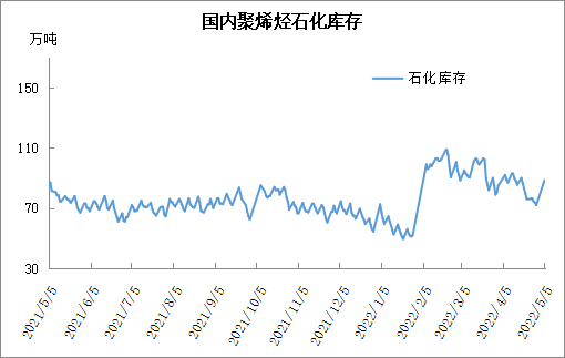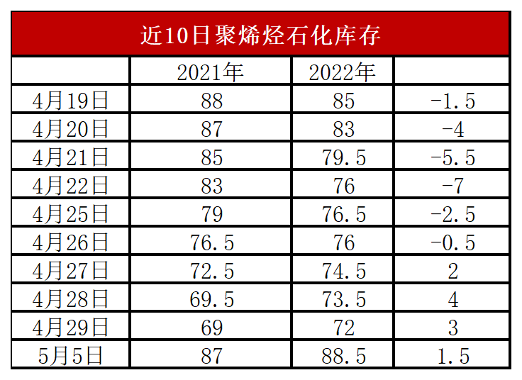 五一小长假石化累库16.5万吨,节后库存涨至88.5万吨,较去年同期高1.5万吨。五一长假石化累库基本在预期之内,目前石化检修力度有所减弱但是聚烯烃开工率依然在90%以下,供应端暂时压力不大,需求虽然整体偏弱,但是疫情逐渐控住,需求有边际回暖预期。目前两桶油库存不高,但是煤化工及社会库存偏高,整体去库仍有难度。