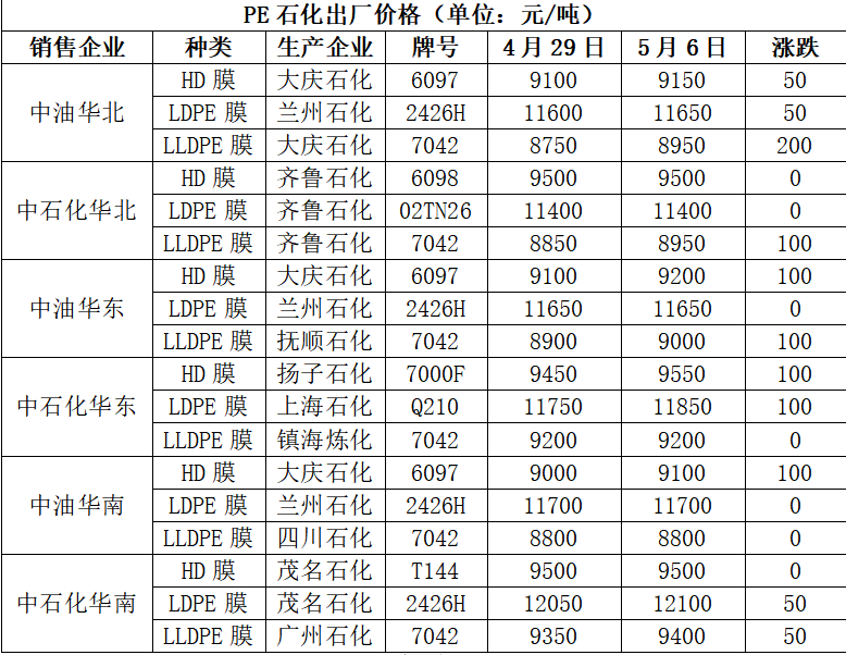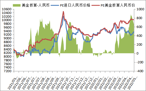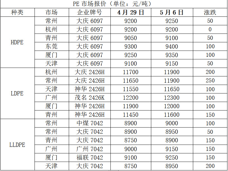 本周PE进口线性美金主流报价1220-1240,折算人民币成本在10000-10150,市场主流9300-9400,高国产线性400左右。