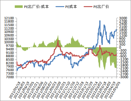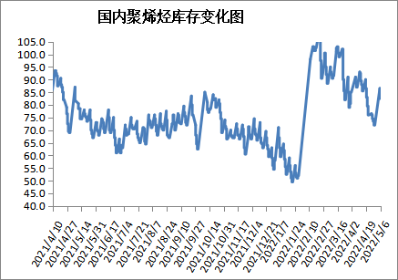 截至5月6日生产企业聚烯烃库存在82.5万吨,较上周同期上升10万吨,国内PE生产企业产量上升,以及五一假期,导致国内聚烯烃库存上升,下周PE检修装置开车计划较少,部分地区疫情缓解,下游需求仍有修复预期,有利于库存消化。