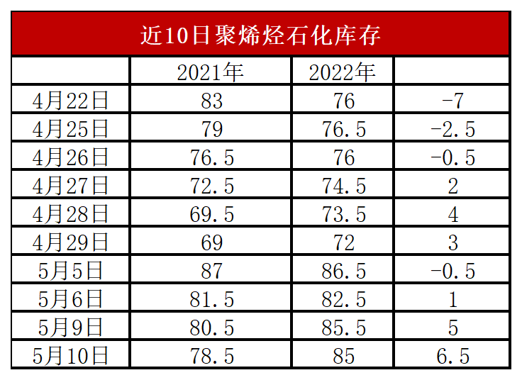 周二石化库存85万吨,较昨天下降0.5万吨(昨天修正为85.5万吨),较去年同期高6.5万吨。近期石化去库速度放缓,开始逐渐高于去年同期水平。3月份以来两桶油执行降负保价政策,执行完毕后并未出台最新的降负措施,聚烯烃开工率较前期有所提高,尤其是PE开工率提高明显,供应利好减弱,而需求端依然低迷,且目前社会库存偏高,导致石化去库难度加大。