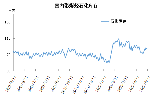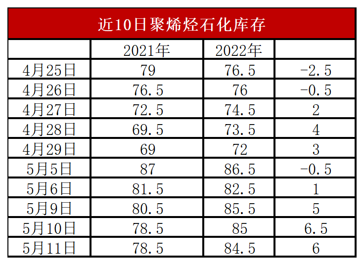 周三石化库存84.5万吨,较昨天下降0.5万吨),较去年同期高6万吨。近期石化去库速度放缓,开始逐渐高于去年同期水平。3月份以来两桶油执行降负保价政策,执行完毕后并未出台最新的降负措施,聚烯烃开工率较前期有所提高,尤其是PE开工率提高明显,供应利好减弱,而需求端依然低迷,且目前社会库存偏高,导致石化去库难度加大。