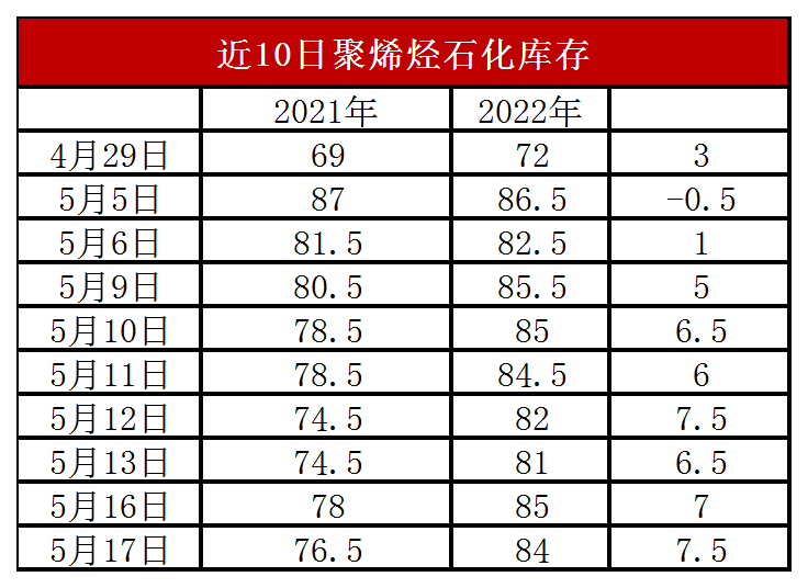 周二石化库存84万吨,较昨天下降1万吨,较去年同期高7.5万吨。3月份两桶油降负保价后近期两桶油开工率略有提高,供应端利好有限,需求端继续维持低迷态势,加之目前社会库存偏高,聚烯烃去库难度加大,近期去库速度明显放缓,后期除非需求有明显改善,否则去库难度依然较大。
