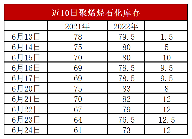 周五石化库存73万吨,较昨天下降3.5万吨(昨天修正为76.5万吨),较去年同期高12万吨。经历了6月份大部分时间缓慢去库之后,近期石化库存略有提速,本周石化去库10万吨。目前聚烯烃计划内检修依然较多,加之上海石化、茂名石化等装置意外停车,聚烯烃开工率明显下降,供应减少。需求端虽然整体偏弱,但是考虑价格下跌后抄底及点价明显增多,石化去库提速,但是依然处于历史同期高点。