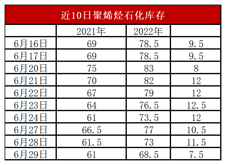 周三石化库存68.5万吨,较昨天下降4.5万吨,较去年同期高7.5万吨。下旬开始石化去库提速,一方面聚烯烃计划内检修依然较多,聚烯烃开工率明显下降,供应减少,另一方面需求边际改善,尤其是低价点价成交增多,加之月底石化考核背景下贸易商拿货增多,推动石化快速去库。