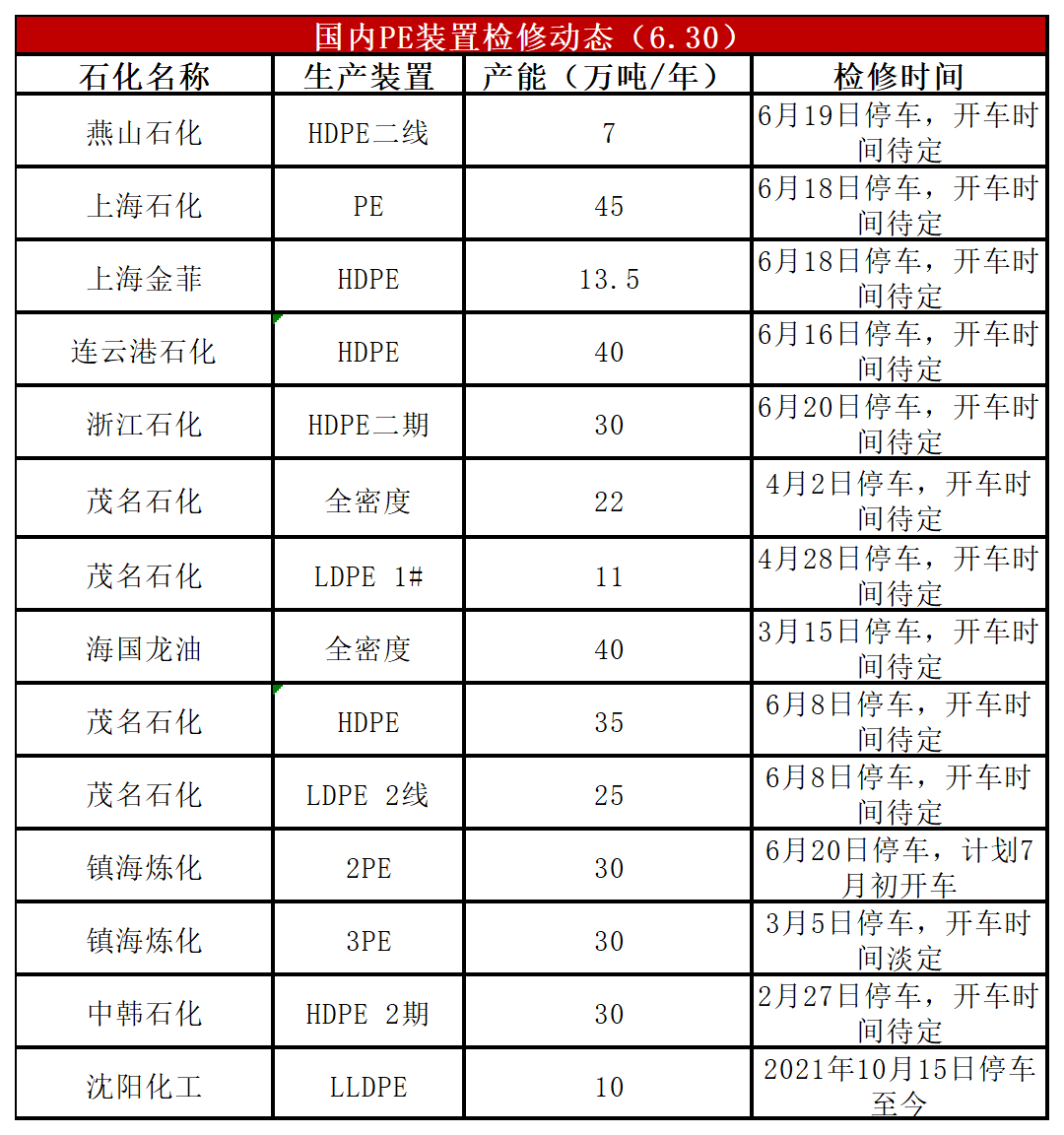 今日PE检修装置变化不大,PE开工负荷维持84%左右,与上周同期基本持平,较去年同期下降8%。本周新增检修装置偏少,检修装置开车计划较少,预计 PE开工负荷窄幅波动。