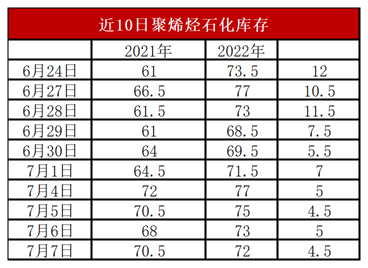 周四石化库存72万吨,较昨天下降1万吨,较去年同期高5万吨左右。经历了月底及月初短暂垒库之后,石化去库重回正轨。目前聚烯烃计划内检修装置较多,加之前期意外停车的上海石化、茂名石化并未重启,PP开工率继续维持85%以下的低位水平。供应压力不大,需求端低价成交好转,近期石化正常去库,暂无库存压力。