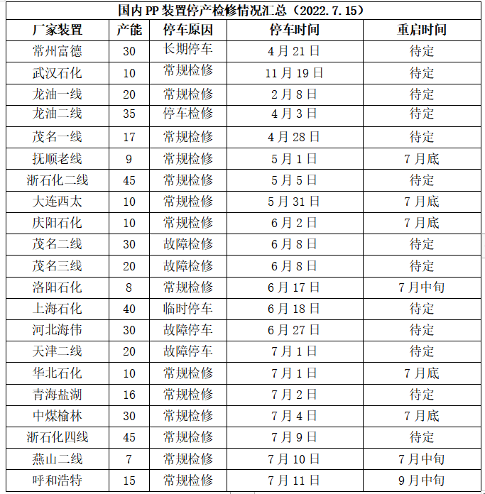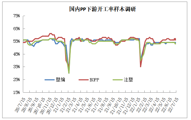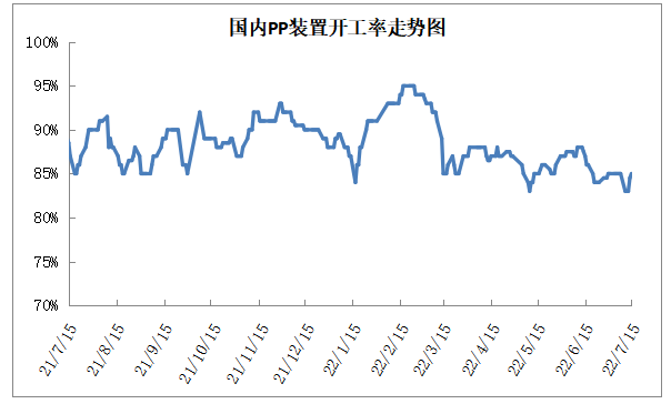 近期福建联合老线故障停车,但是三圆检修装置即将重启,PP开工率变化不大,维持在85%附近,较上周下降1%,较上月下降2%,较去年同期低5%。目前新装置投产有限,开工率维持低位,8月份之前供应压力不大。