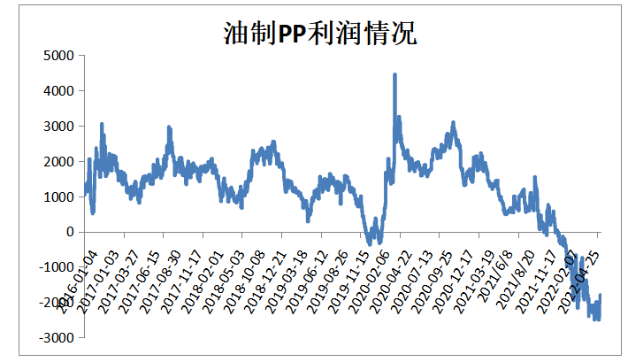 本周油价宽幅震荡。美联储进入加息周期后,7月及9月仍有大幅加息预期,市场担忧全球经济衰退,原油需求大幅下降,导致油价一度大跌至100美元以下。不过原油在95-100美元支撑强劲,且当前原油供需仍偏紧,后期需求下跌仅是预期,油价暂时获得支撑反弹至100美元附近,油制PP亏损收窄至2000以内。