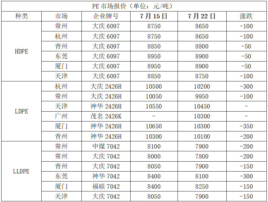 PE现货市场维持震荡下跌行情,PE装置负荷降幅有限,下游需求反弹乏力,两油、煤化工以及社会库存消化缓慢,尤其是原油及塑料期货持续走弱,打压买家购买积极性,PE现货市场报价下跌。华北市场LLDPE主流7900-8000,LDPE主流10100-10450;华东市场LLDPE主流7800-7900,LDPE主流9950-10200,HDPE主流8600-8700;华南市场LLDPE主流8100-8250,LDPE主流10200-10300,HDPE主流8800-8900。