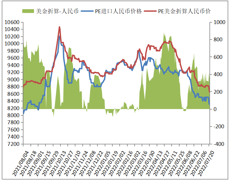 本周PE进口线性美金主流报价下跌至1030-1060,折算人民币成本在8600-8850,市场主流7800-8300,高国产线性0-300。