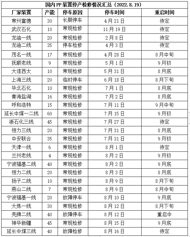 本周PP需求雪上加霜。8月中旬是往年PP需求淡季向旺季过渡阶段,但是今年下游需求启动缓慢,暂无实质性备货现象,并且近期南方部分地区高温限电,导致部分地区下游开工率下降,尤其是BOPP集中的江浙地区影响较为明显。虽然限电是短期行为,但是宏观背景下预计金九银十兑现力度有限。
