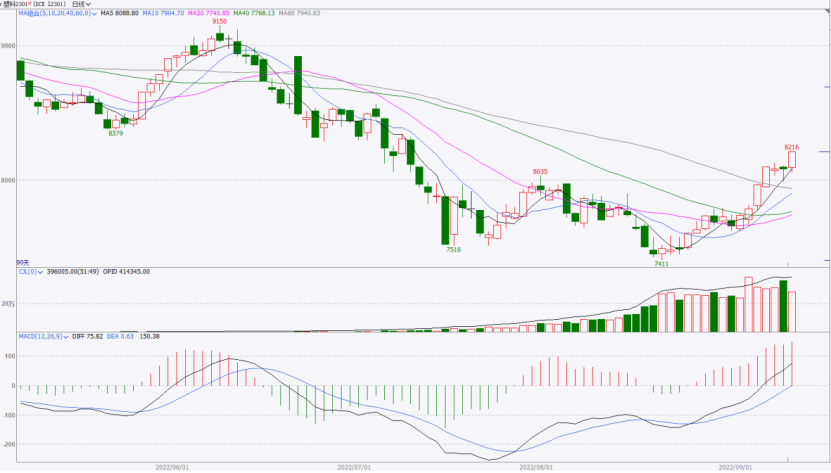 本周塑料期货走势上涨为主,日均线逐渐转为多头排列, MACD指标红柱维持且持续变长, KDJ指标继续向上发散,即将超涨,持仓量增长但是成交量略有减少,盘面上涨动力强劲,但是情绪面发酵为主,下游需求好转有待观察,预计塑料主力先涨后跌,仅供参考。