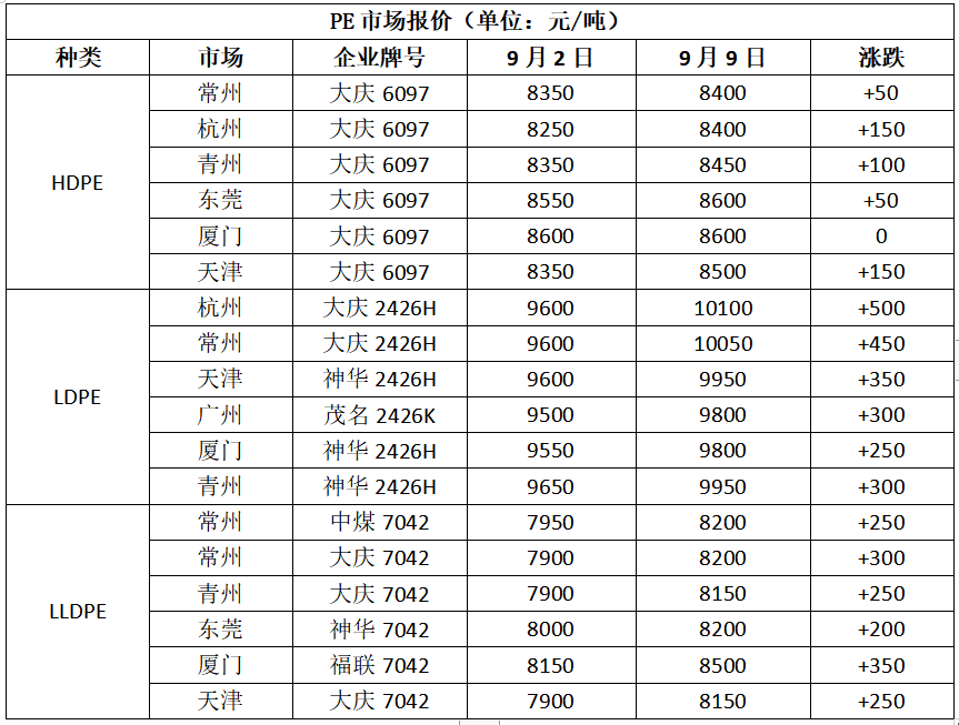 本周聚乙烯推涨后高位整理。“金九十银”旺季背景下,市场投机交易增加,再加上临时停车装置增多,部分资源阶段性供需失衡,叠加中秋节前备货需求,聚乙烯价格迅速推涨。但是下游需求并未根本性好转,成本端原油连续下跌,市场心态转为观望,聚乙烯价格高位整理。华北市场LLDPE主流8100-8200,LDPE主流9950-10000,HDPE主流8350-8650;华东市场LLDPE主流8100-8150,LDPE主流9750-9950,HDPE主流8550-8750;华南市场LLDPE主流8250-8550,LDPE主流9650-9800,HDPE主流8600-8900。