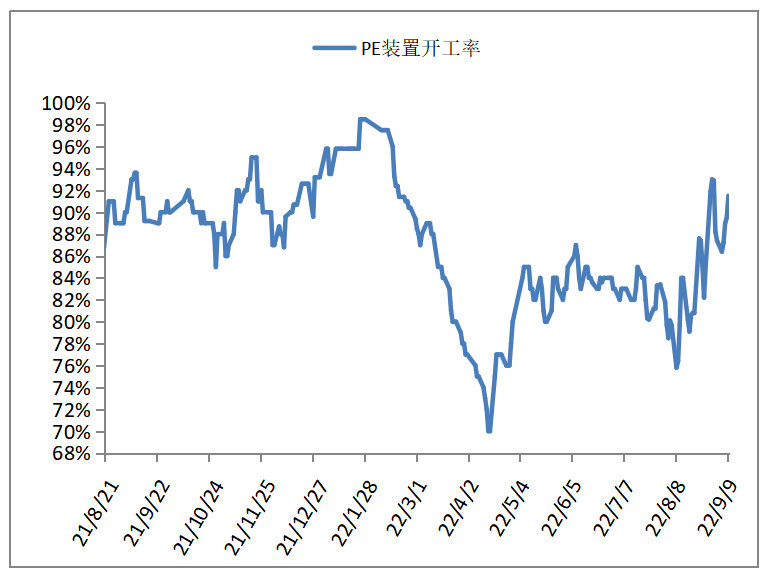 本周PE检修装置和开车装置都较多, PE开工负先跌后涨,上涨至92%左右,比上周同期上涨4%,较去年同期下降2%。PE临时停车装置多计划近期开车,预计PE开工负小幅上涨。