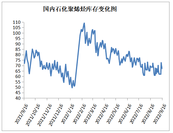 截至9月16日石化聚烯烃库存在62万吨,较上周同期增加5万吨。石化库存小幅积累,主要因为经历中秋节假期,石化开单减少,因此去库放缓;再加上临近交割,市场资源不多,节前石化多看涨后市,部分惜售,也是石化去库放缓的重要原因。