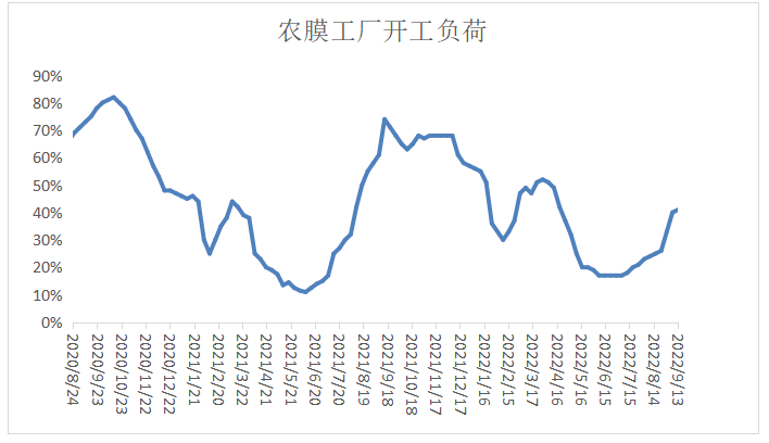 本周农膜开工负荷小幅上涨1%,棚膜旺季即将来临,订单略有好转,旺季临近,但是并未有根本性好转,阶段性补库结束,观望心态增强,原料库存增加。农膜开工继续提升,旺季逐渐来临,预计下游农膜开工负荷震荡上升。