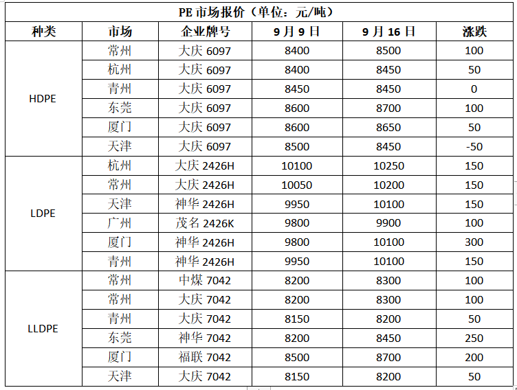 本周中秋节后,聚乙烯价格冲高回落,走势与节前预计背离,基本面尚可,但是宏观较差,消息面影响加大,而下游工厂阶段性备货结束,需求并未根本好转,市场价格走弱后观望气氛更加浓厚,聚乙烯市场价格重心先涨后跌。华北市场LLDPE主流8120-8250,LDPE主流10050-10100,HDPE主流8400-8750;华东市场LLDPE主流8250-8350,LDPE主流9750-10250,HDPE主流8700-8850;华南市场LLDPE主流8450-8700,LDPE主流9850-9950,HDPE主流8650-8950。