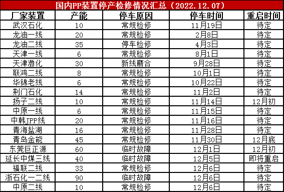 浙江石化、延长中煤、中原石化等部分装置停车检修,PP开工率继续下降,目前在85%附近,较上周下降3%,较上月同期低4%,较去年同期低6%。新装置投产推迟,开工率维持低位,供应压力极大缓解。