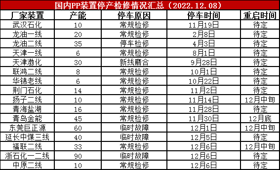 近期浙江石化、延长中煤、中原石化等部分装置停车检修,PP开工率降至85%附近,较上周下降3%,较上月同期低4%,较去年同期低6%。新装置投产推迟,开工率维持低位,供应压力极大缓解。