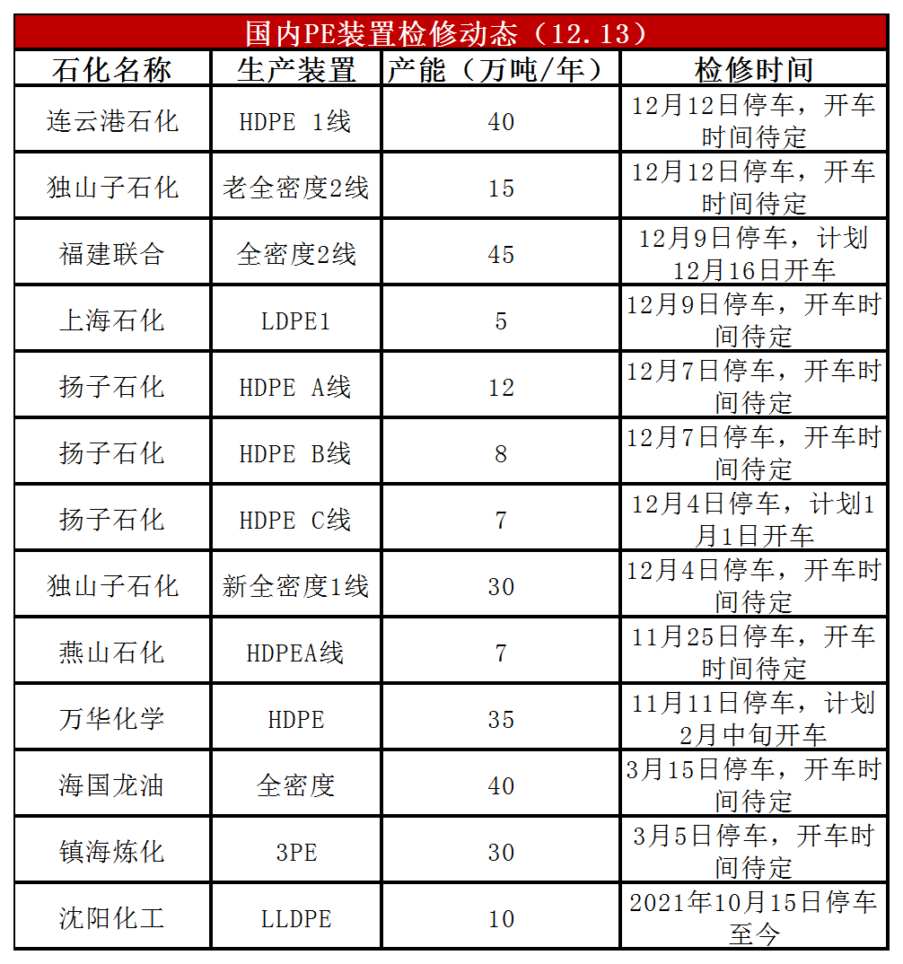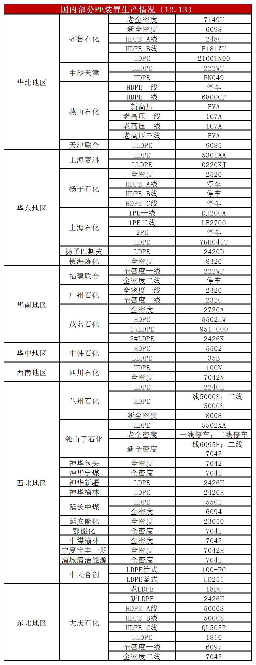PE装置中沙天津HDPE、上海赛科全密度、独山子新全密度开车,连云港石化HDPE、独山子石化老全密度停车,开工负荷上升至92%左右,比上周上升2%,较去年同期上涨3%。浙石化HDPE计划停车,福建联合全密度有开车计划,预计PE开工负荷变化不大。