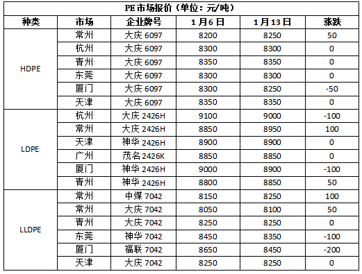 华北市场LLDPE主流8200-8250,LDPE主流8850-8950,HDPE主流8150-8500;华东市场LLDPE主流8050-8200,LDPE主流8750-9100,HDPE主流7950-8500;华南市场LLDPE主流8300-8450,LDPE主流8850-9000,HDPE主流8500-8650。