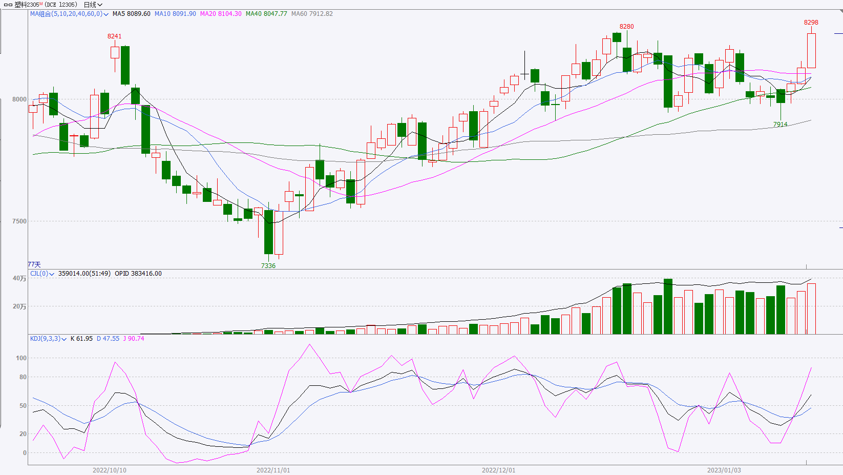 本周塑料期货上涨为主。均线转为多头排列,MACD绿柱缩短,DIFF线和DEA线走势转为偏强;KDJ指标向上形成金叉后继续上涨,即将超涨,资金拉涨明显。L05突破前期新高,上方压力较大,虽然资金持续进入拉涨,但是成交放缓明显,难以跟进,各指标提示仍有上涨空间,但是涨幅受限,预计L05维持走势较强,不排除资金撤离下跌的可能,仅供参考。
