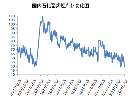 截至1月13日石化聚烯烃库存在49万吨,较上周减少7万吨,石化库存下降明显。主要是因为临近春节假期,贸易商积极完成计划;再加上下游工厂备货尾声,宏观提振下,贸易商多推涨谨慎,出货为主,市场资源顺利转移到下游手中,两油库存去化明显。