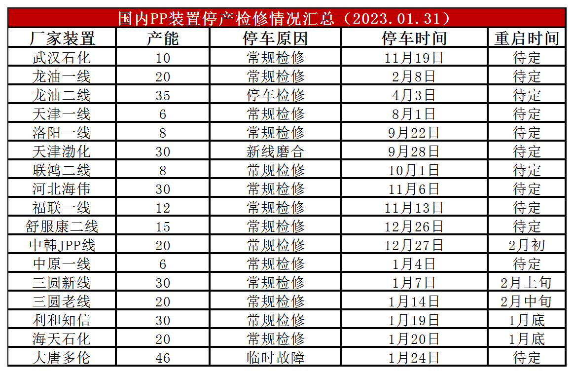 春节及节后海天石化、大唐多伦等装置停车,不过节后海伟开车,PP开工率在89%附近,较春节之前下降1%,较上月同期下降1%,较去年同期下降2%。目前PP开工率处于历史同期低位,新装置暂未集中投产,供应压力不大,不过需要关注2月份新装置投产情况。