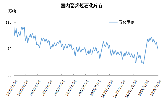 周五石化库存68.5万吨,较昨天下降2.5万吨,较去年同期低超过20万吨。近期石化继续保持快速去库状态,目前库存跌破70万吨大关,远低于往年同期。本周市场止跌反弹,刺激贸易商及下游拿货补库积极性提高,加之上游检修装置较多,尤其是PP开工率降至85%附近,极大缓解供应压力。不过目前虽然上游库存维持低位,但是社会库存居高不下,后期存在一定隐患。