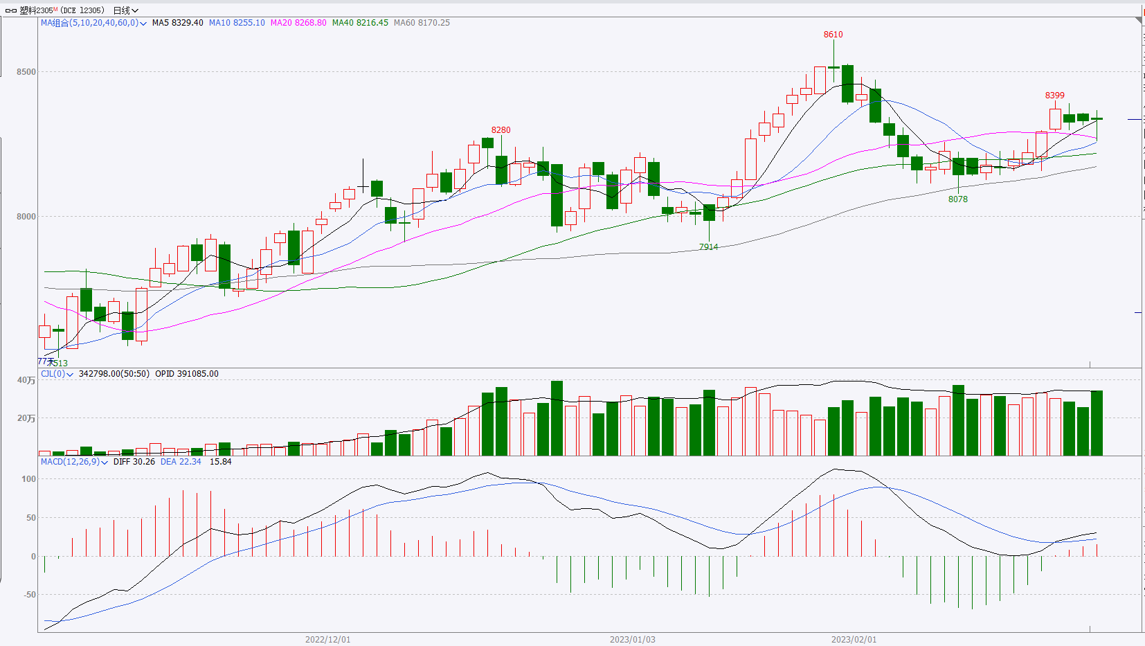 本周塑料期货上涨后横盘整理。均线维持多头排列,突破20日均线后在8300上方站稳,MACD绿柱转红柱且逐渐延长;KDJ指标形向下发散即将形成金叉,多头和空头均不坚定。多头推涨不坚定,持仓量和成交量均下降,盘面整体维持横盘, MACD指标提示L05有上涨空间,KDJ指标提示上方压力明显, 预计L05 或维持高位整理,等待消息面指引,仅供参考。