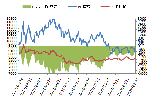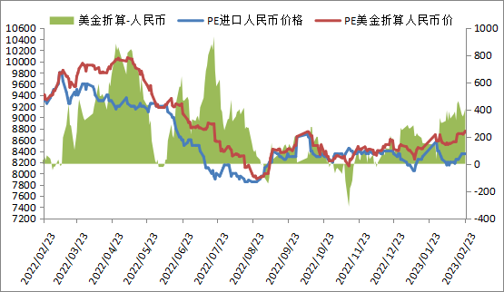 本周PE进口线性美金主流价格小幅上涨,周末在1030-1060,折算人民币成本在8700-8950,市场主流维持8250-8300,高国产线性450-650,价差扩大。