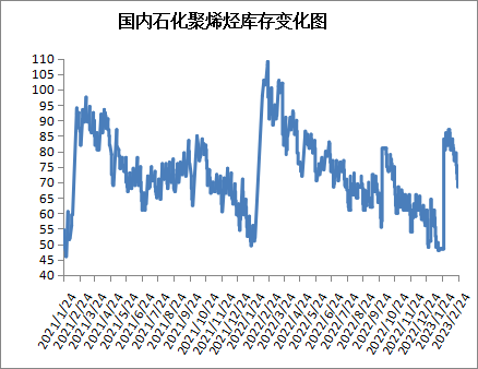 截至2月24日石化聚烯烃库存在68.5万吨,较上周减少8.5万吨,石化库存加速去化,创三年来同期的最低位。主要因为下游开工负荷加速恢复,刚需增强,市场资源向下传导较顺畅;其次因为盘面拉涨下,投机交易增加较多,基差走弱下套保商也开始收货,加速库存消化,所以石化库存加速下跌。