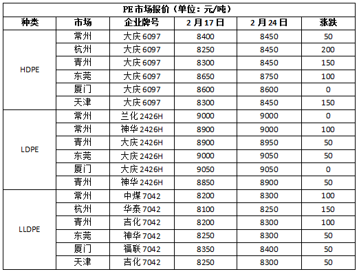 华北市场LLDPE主流8250-8320,LDPE主流8850-9000,HDPE主流8350-8750;华东市场LLDPE主流8250-8450,LDPE主流8850-9150,HDPE主流8050-8650;华南市场LLDPE主流8350-8400,LDPE主流9000-9150,HDPE主流8550-8650。