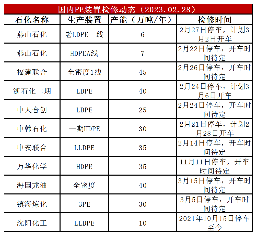 PE装置燕山石化LDPE、福建联合全密度停车,兰州石化HDPE、中天合创LDPE开车,开工负荷维持92%左右,比上周-4%,较去年同期+1%。PE装置镇海炼化全密度计划停车,燕山石化HDPE、中韩石化HDPE计划开车,预计PE开工负荷偏强调整。