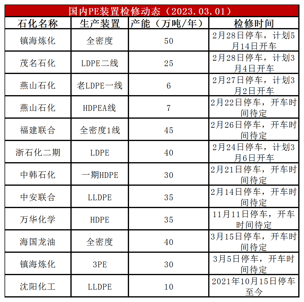 PE装置镇海炼化全密度、茂名石化LDPE停车,中韩石化HDPE开车,开工负荷下降至89%左右,比上周-8%,较去年同期-1%。PE装置连云港石化HDPE、浙江石化HDPE计划停车,燕山石化HDPE计划开车,预计PE开工负荷低位整理。