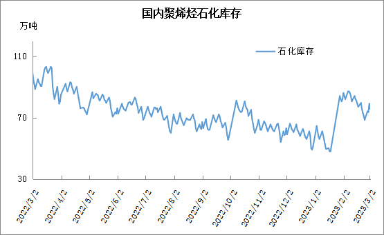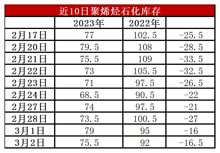 周四石化库存75.5万吨,较昨天下降3.5万吨,较去年同期低16.5万吨。春节过后石化库存保存正常去库,库存远低于去年同期,主要因为上游检修装置较多,供应压力大大缓解,此外上游库存转化为社会库存,库存压力转移。月底石化停销结算短暂垒库后,月初去库恢复正常。
