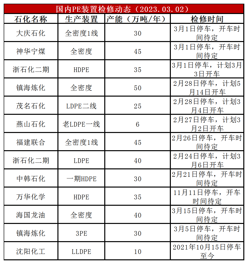 PE装置大庆石化全密度、神华宁煤全密度、浙石化二期HDPE停车,燕山石化HDPE开车,开工负荷下降至85%左右,比上周-10%,较去年同期-3%。PE装置连云港石化HDPE计划停车,浙石化二期LDPE计划开车,预计PE开工负荷低位整理。